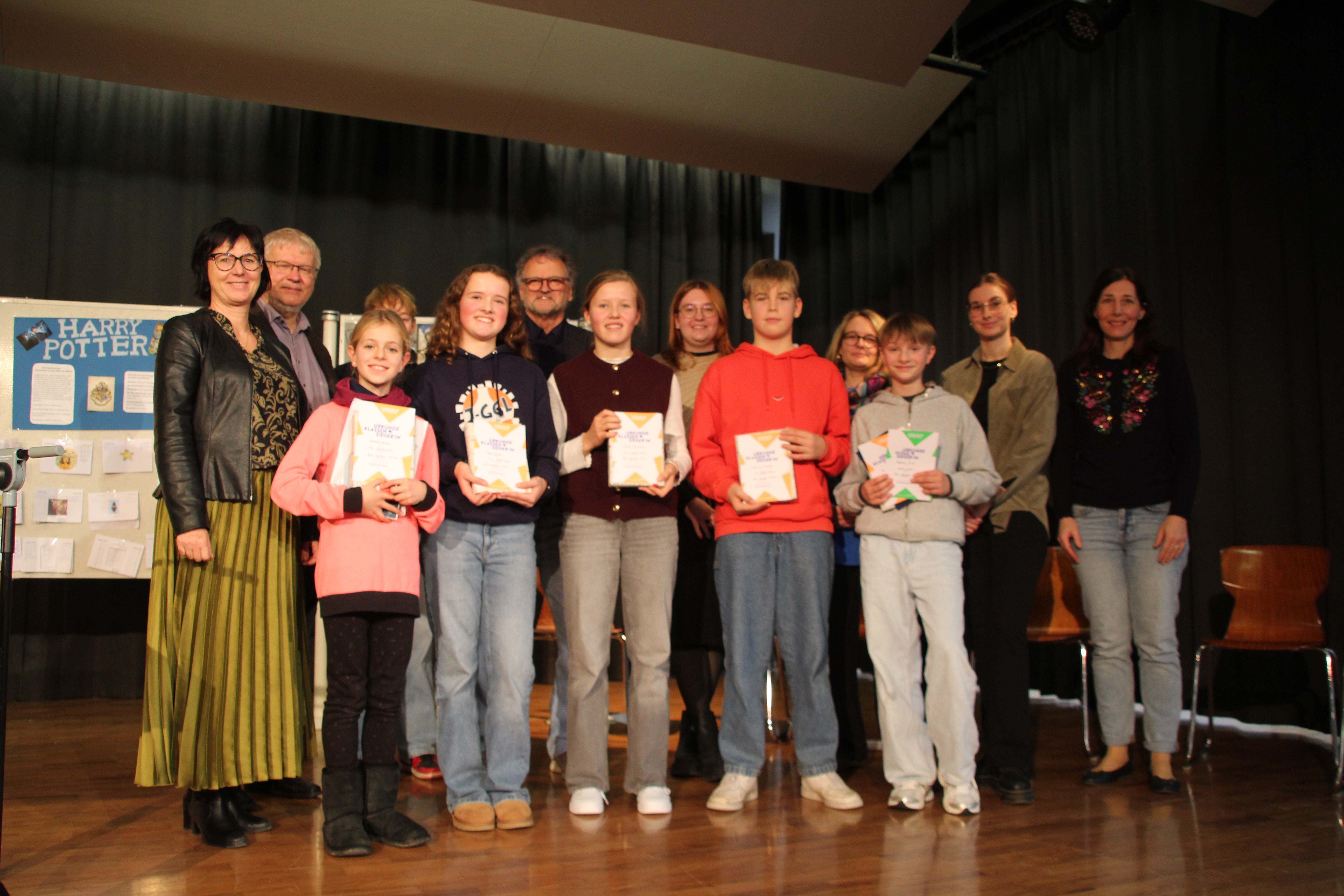 Während die Jury sich zur Beratung zurückzog, wurde das Publikum von Thomas Gölzhäuser mit rhythmischen Klatschübungen bei Laune gehalten. Anschließend dankte Gunda Lange-Böhm allen Beteiligten – insbesondere den Vorleserinnen und -lesern, der Jury, der Organisatorin Sabrina Willershäuser, der Tontechnik und den Hausmeistern – bevor Schulleiterin Astrid Finkeldey das Ergebnis verkündete und Benjamin Arnds als Schulsieger auszeichnete. Im Anschluss erhielten alle Klassensieger Buchpreise und viel Applaus, bevor ein gemeinsames Abschlussfoto den gelungenen Vorlesevormittag nach rund zwei Schulstunden beschloss. Benjamin Arnds wird die Sankt Lioba Schule Anfang des nächsten Jahres dann in der nächsten Runde vertreten – wofür ihm die Schulgemeinschaft viel Erfolg wünscht!